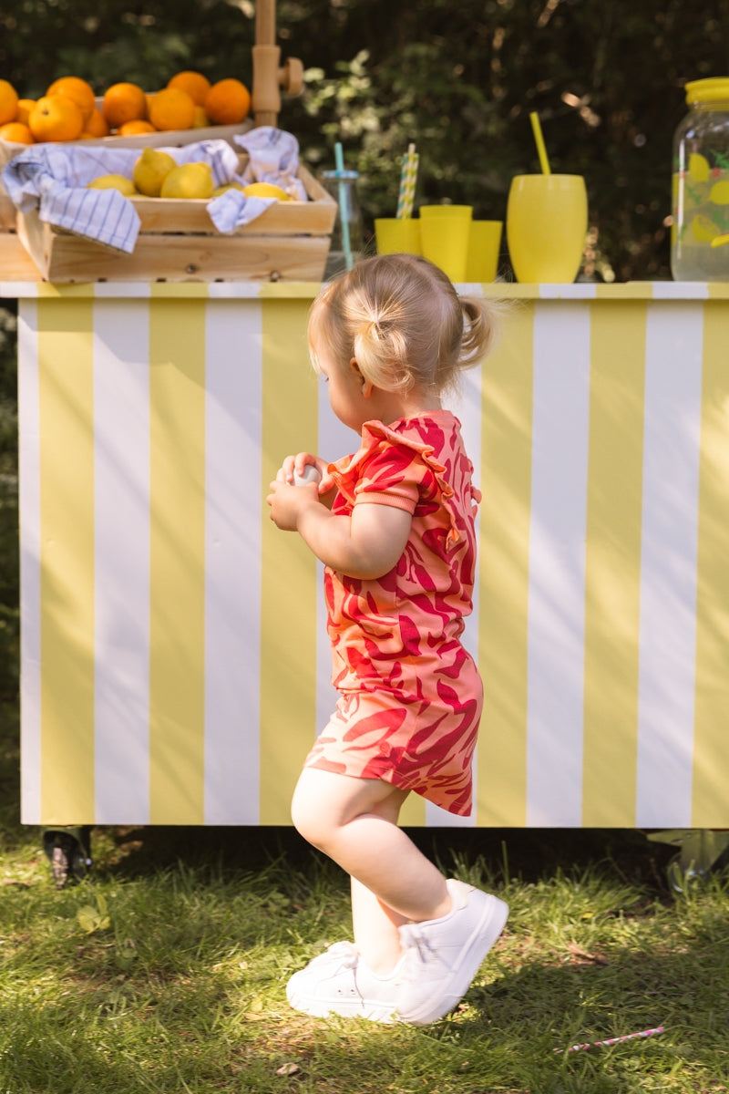 Ein schönes orangefarbenes Kleid mit roten Blumen.