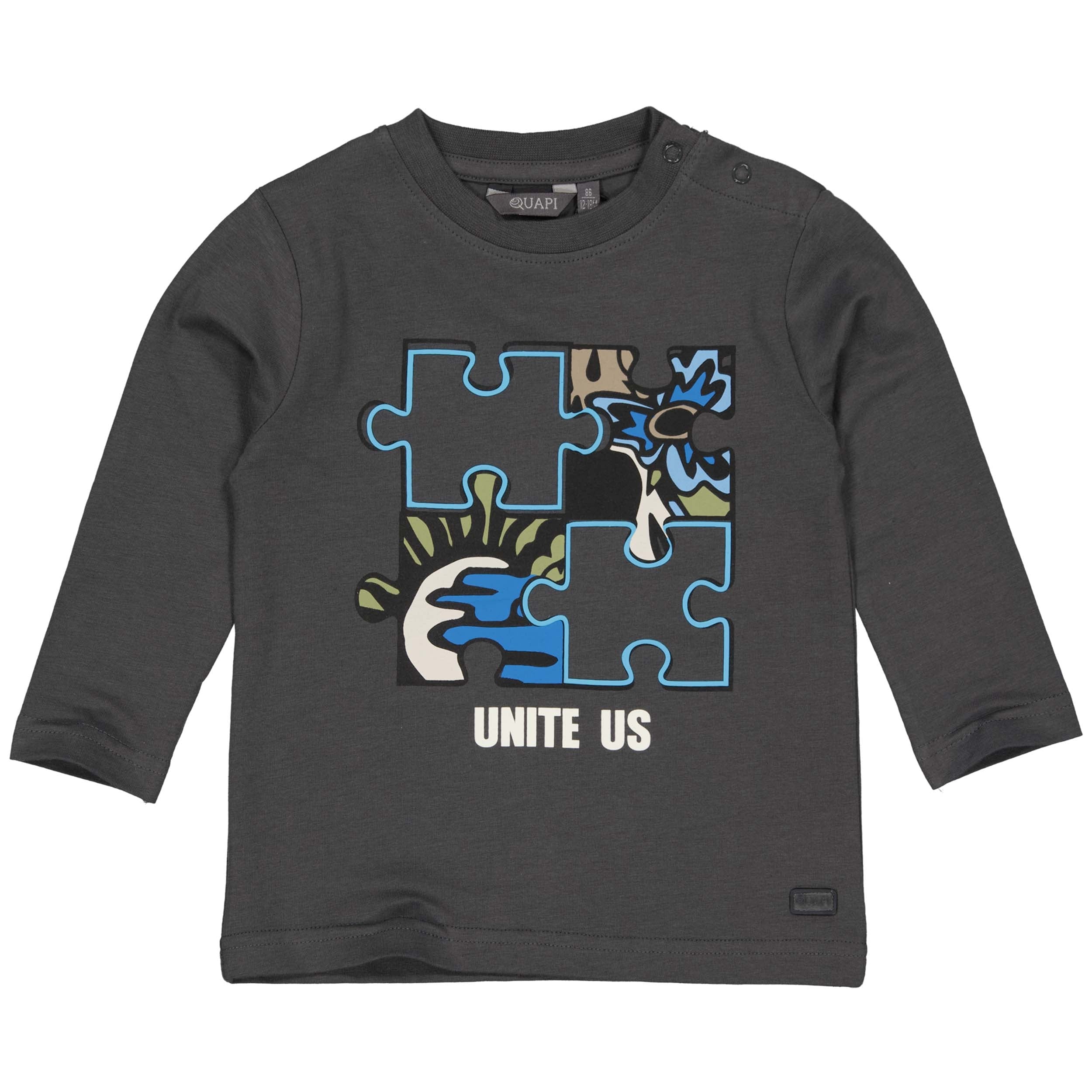 Ein cooles graues Shirt mit einem Puzzle-Print auf der Vorderseite.